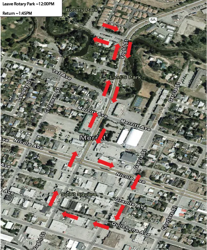 Route for Saturday's MMIWG2S+ Memorial March on Saturday Feb.14 at noon. (map courtesy of City of Merritt)